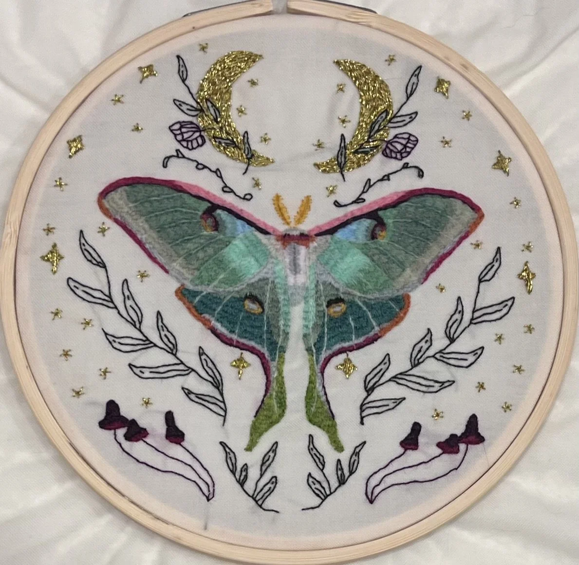 A luna moth stitch using the “painting with thread” method! Finally finished. Washed and ready to dry and will soon iron and mount. More pictures (of higher quality) coming soon. Modified from a pattern by @the_anxious_stitcher,